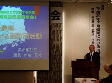 「平成30年7月豪雨における消防団活動」と題した講演では、災害が起きる直前、直後の映像や写真を基に消防団活動を解説していただき、実体験からの学び・気付きを御講演いただきました。