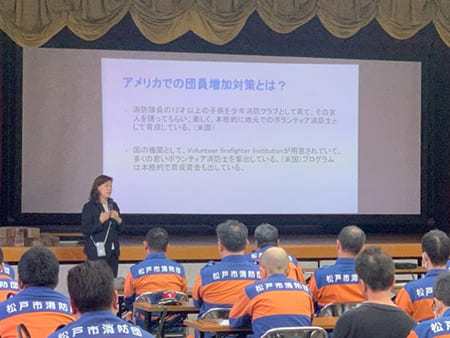 令和6年11月2日(土)、千葉県松戸市の松戸市消防局において、一般社団法人リスクウォッチの長谷川祐子氏を講師にお迎えし、「新たな災害環境に対応する消防団のあり方に関する講座」を実施しました。