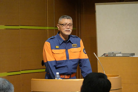 「令和元年房総半島台風時の館山市消防団の活動について」と題した講演では、館山市消防団の活動紹介からはじまり、多くの被害を受けた房総半島台風での課題や改善した点等を講演いただきました。