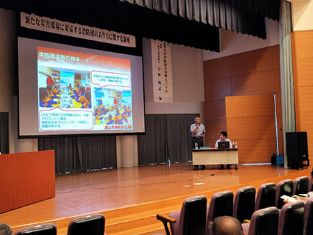 「館山市消防団の活動について」と題した講演では、時代とともに変わりゆく消防団のあり方について、実際に行われている取組や災害対応、女性団員の活動等を事例に消防団組織として、今、何ができるかを説明していただきました。参加された方からは、自主性・主体性のある館山市消防団の組織づくりに対して強い関心が寄せられ、大変有意義な講義になりました。